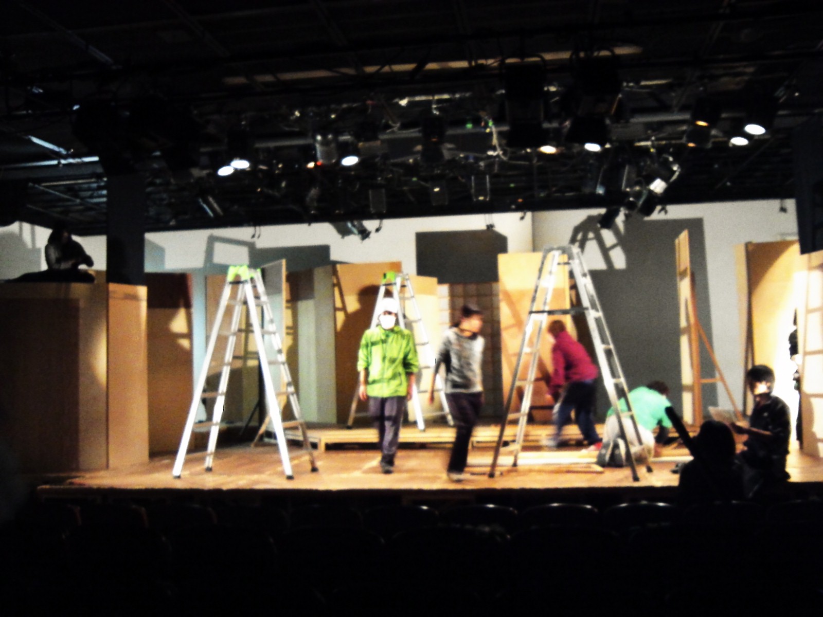 公演開始から2週間ほど経過し、一度小ホールで実際に舞台を建て込んだり、照明やスピーカーを吊り込んだりしました。